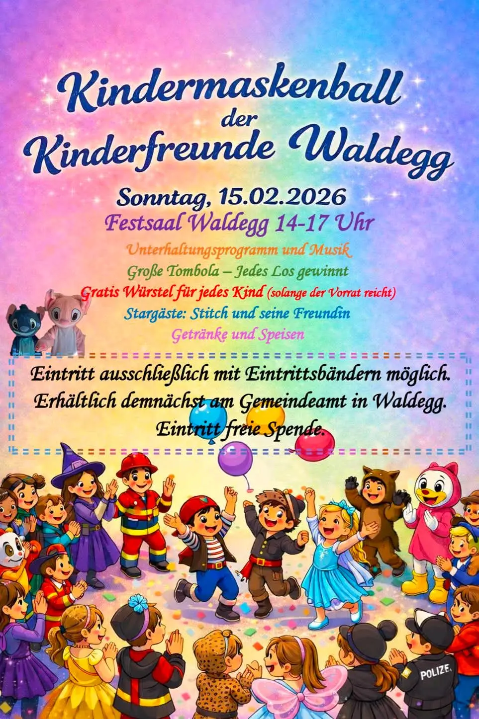 Aufgrund der gültigen branschutztechnischen Bestimmungen ist die Teilnahme am diesjährigen Kindermaskenball nur begrenzt möglich. Die Eintrittsbänder können ab Montag den 27.01.2025 zu Öffnungszeiten (Montag bis Freitag 11.00 - 17.00 Uhr in der Waldegger WüHü oder nach Absprache bei Coldula Gaugusch Tel.0676 9711655 abgholt werden. Eine Teilnahme ist ausschließlich mit Eintrittsbänder möglich. Für spontan Entschlossene werden wir die Verfügbarkeit der Bänder regelmäßig bekannt geben. Wir bitten um Verständnis und freuen uns euch begrüßen zu können.